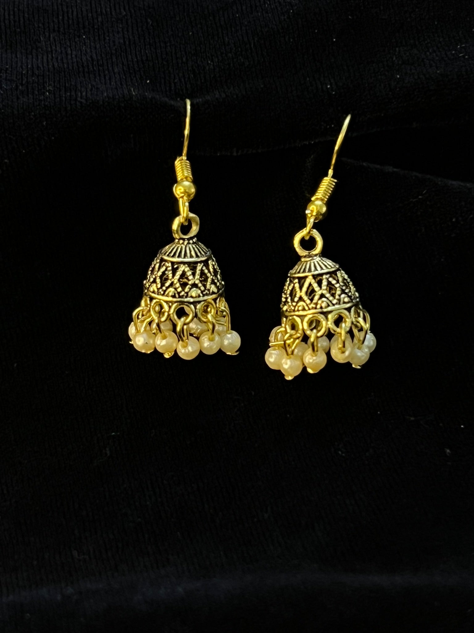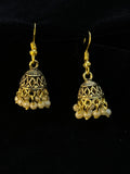 Elegant jhumka earrings featuring intricate dome detailing with pearl bead drops.