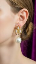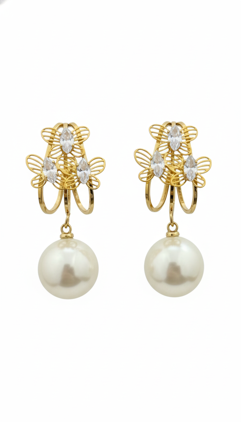 Elegant butterfly crystal earrings featuring sparkling stones with a pearl drop.