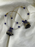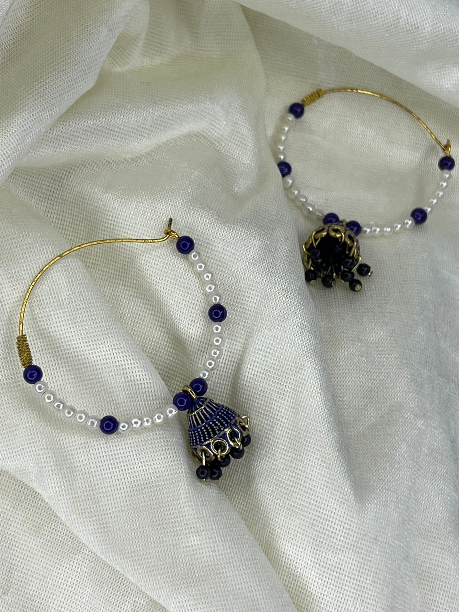 Elegant hoop earrings adorned with pearl beads and royal jhumka drops.