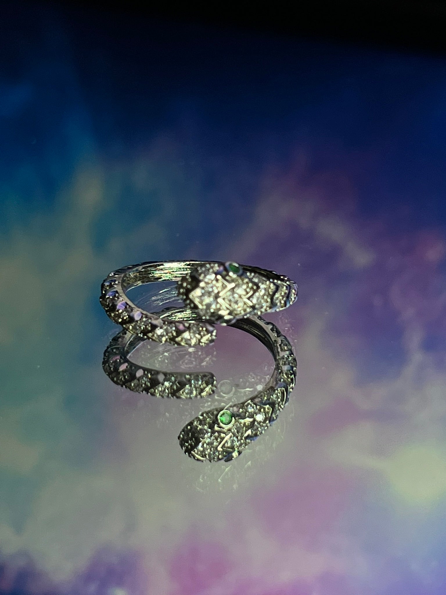 Stylish serpent wrap design ring with sparkling crystal stones.