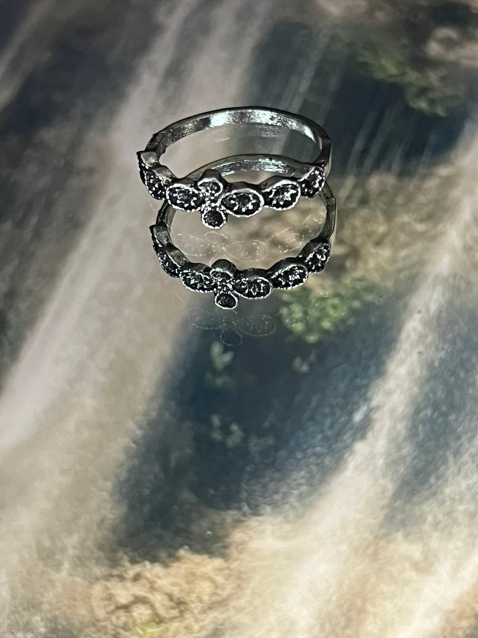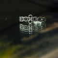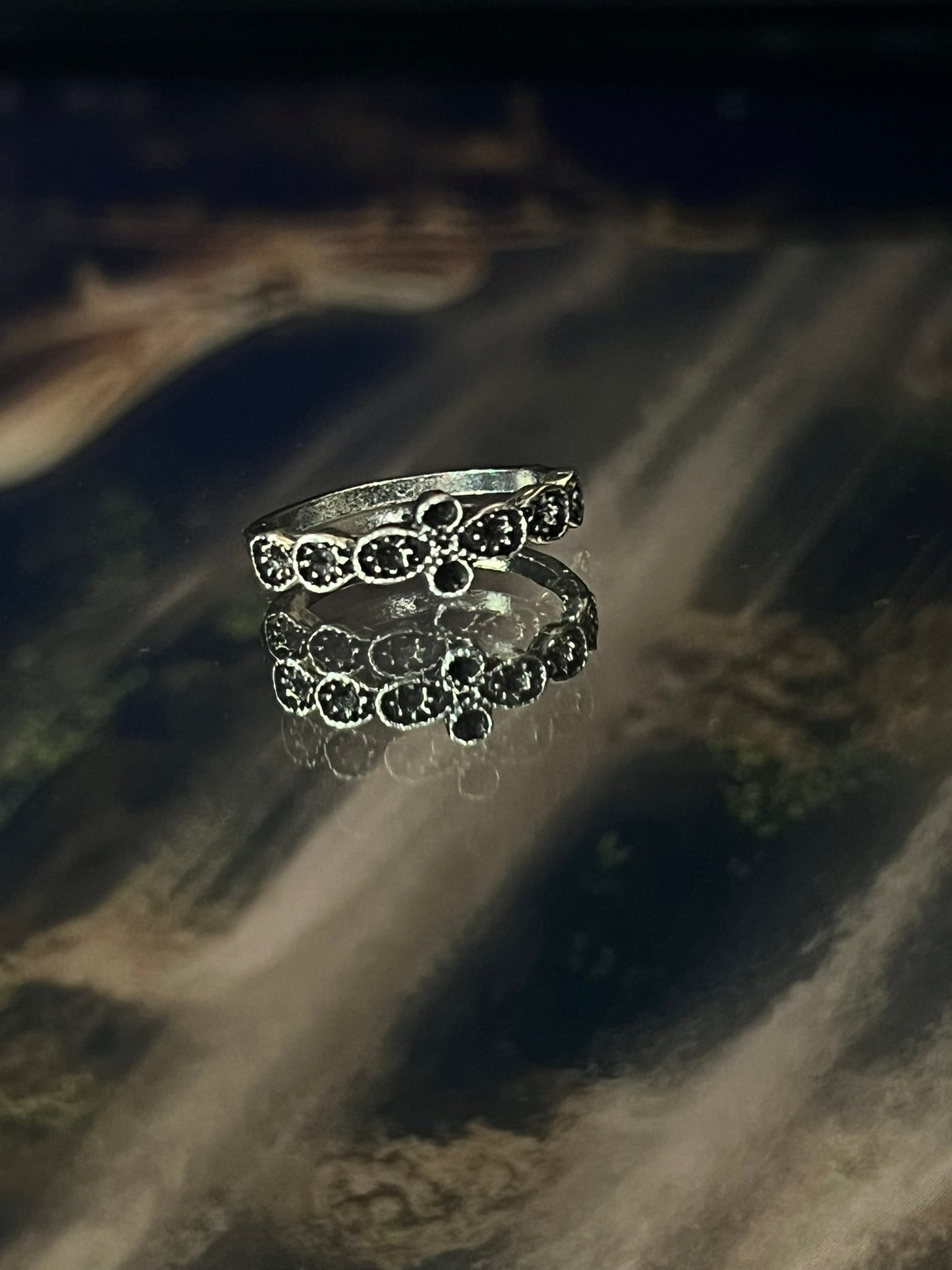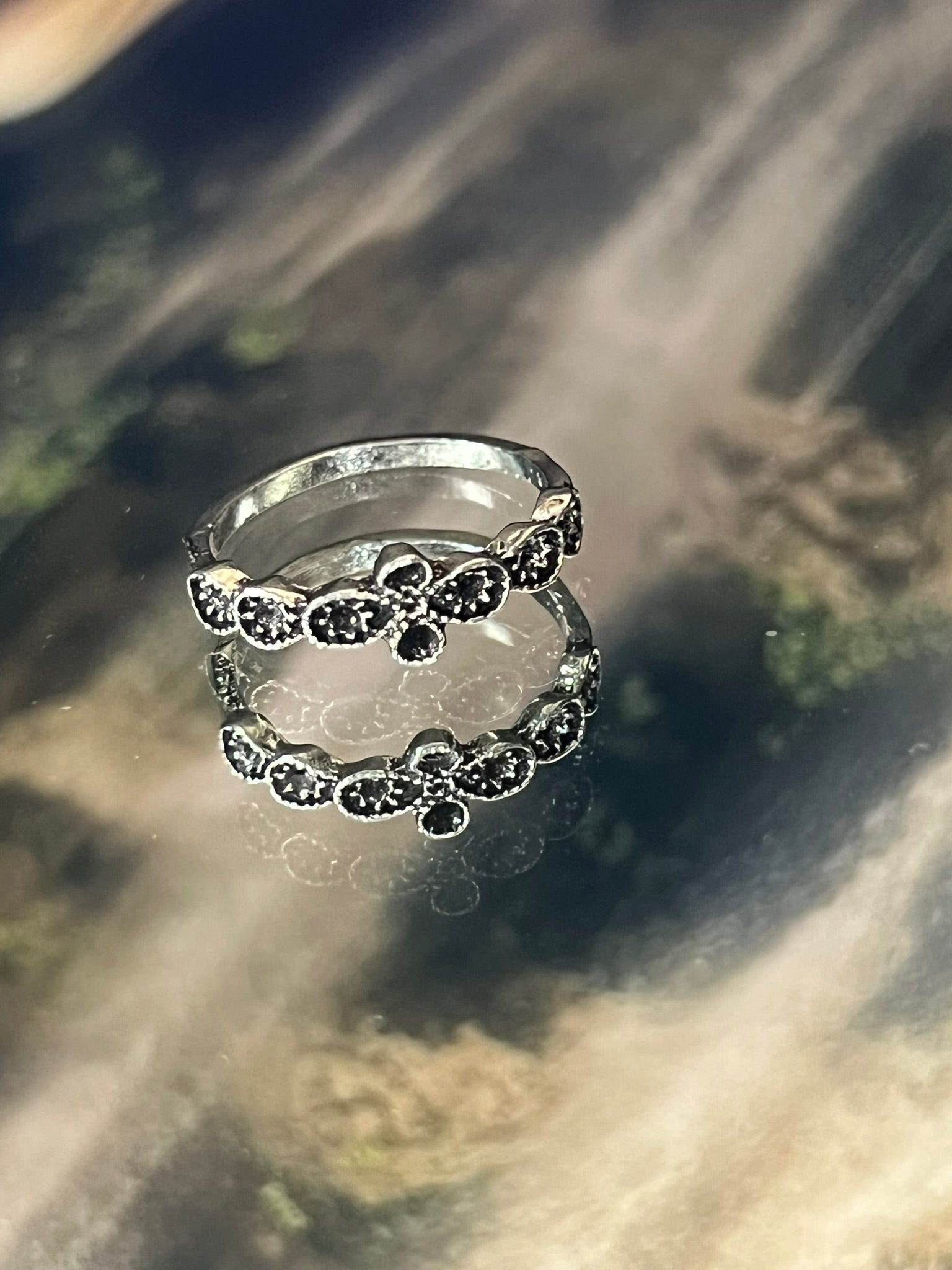 Elegant silver ring featuring black floral stones.